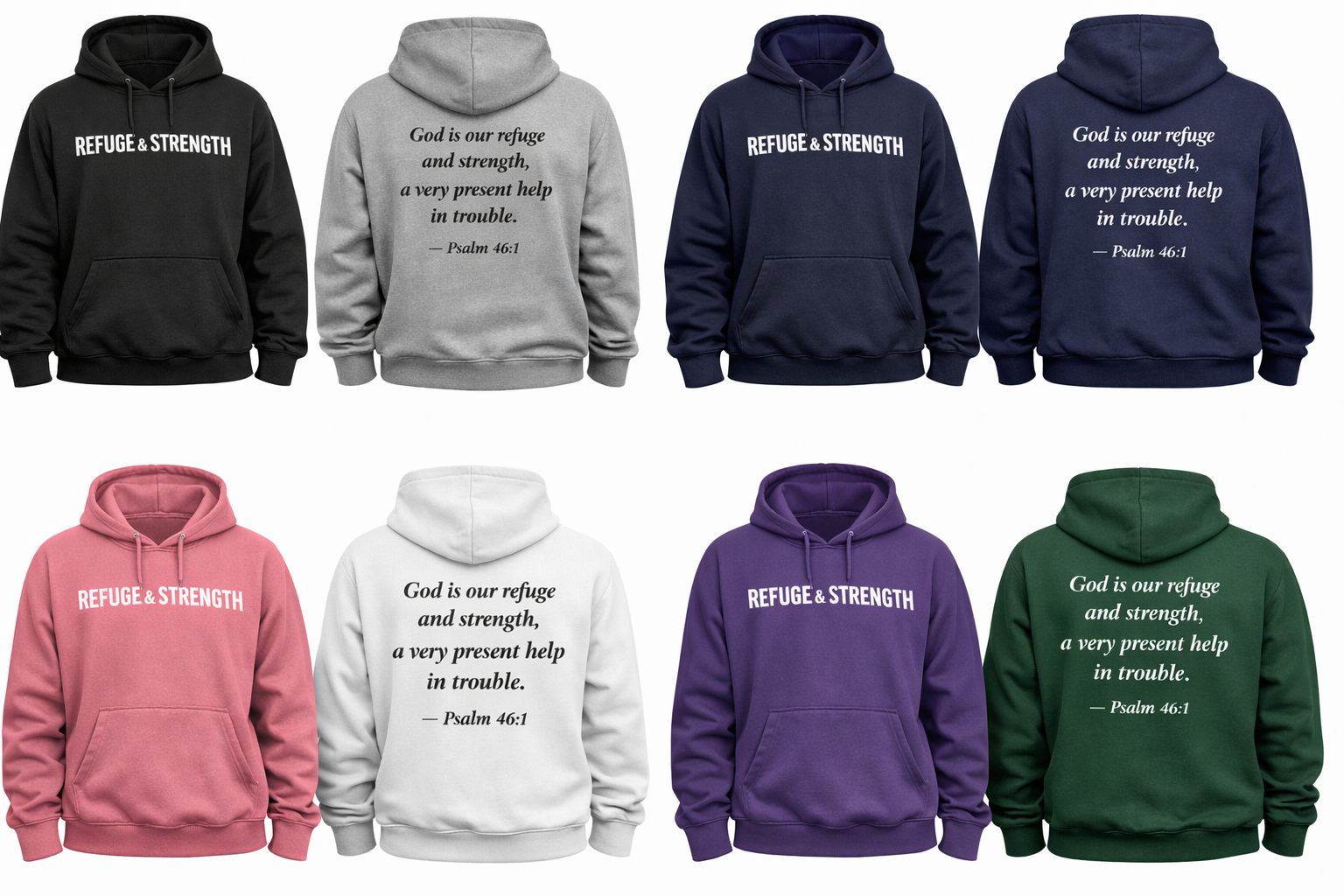 This Christian hoodie is available in multiple stylish colors including black, gray, navy, pink, white, purple, and green, making it easy to choose a look that matches your personal style. The minimalist typography keeps the design modern and versatile while allowing the powerful Scripture message to stand out. Whether you’re buying it for yourself or as a thoughtful gift for a friend, family member, or fellow believer, this Psalm 46:1 hoodie offers encouragement, warmth, and inspiration all in one.God is our refuge and strength